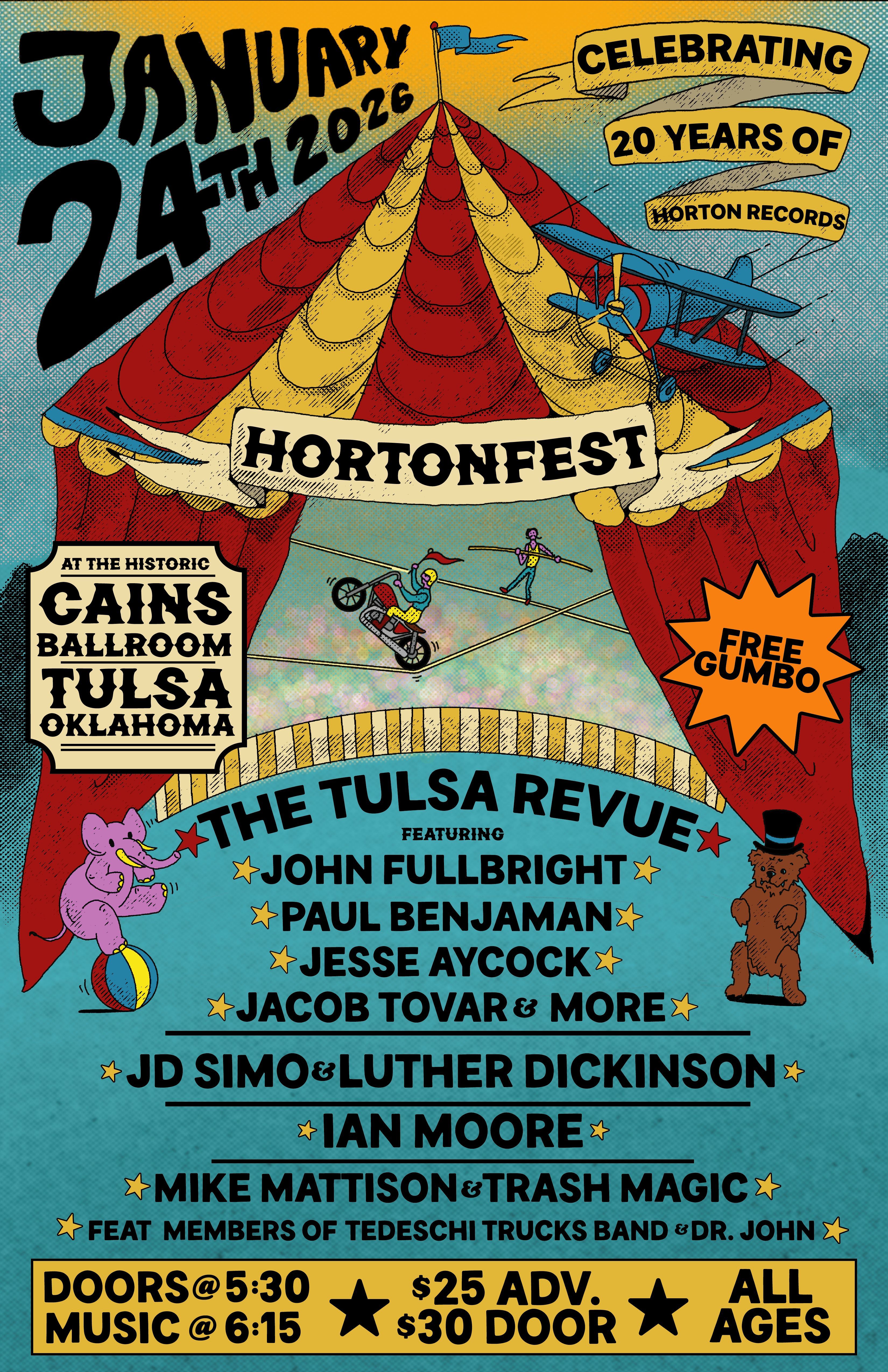 TULSA, Okla. Aug. 27, 2025 – Tickets are on sale today, Wed., Aug. 27 for Hortonfest at Tulsa’s historic Cain’s Ballroom Sat., Jan. 24, 2026. This event celebrates 20 years of Horton Records, a Tulsa-based nonprofit supporting Oklahoma musicians and music projects, as well as the birthday of the organization’s founder and president, Brian Horton. The evening features a lineup of local and nationally touring acts and free gumbo (while it lasts).